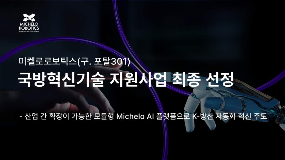 2025년 10월 20일, 서울- ㈜미켈로로보틱스(대표 박장준, 구. 포탈301)는 국방기술진흥연구소 주관 ‘국방벤처 혁신기술 지원사업’의 ‘지능형 자율도장 로봇시스템’ 개발 과제에 최종 선정되었다고 20일 밝혔다.